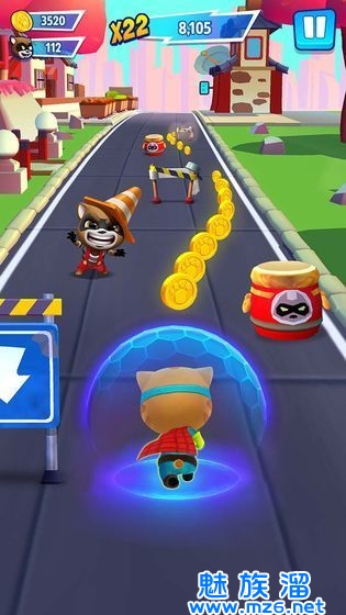 开始游戏时,汤姆猫在击打浣熊时会碰到不少障碍哦。当小伙伴们看到障碍物时,左右滑动屏幕来进行躲避,在躲避的过程中也会收获不少金币哦,金币可以用来修复城市建筑。