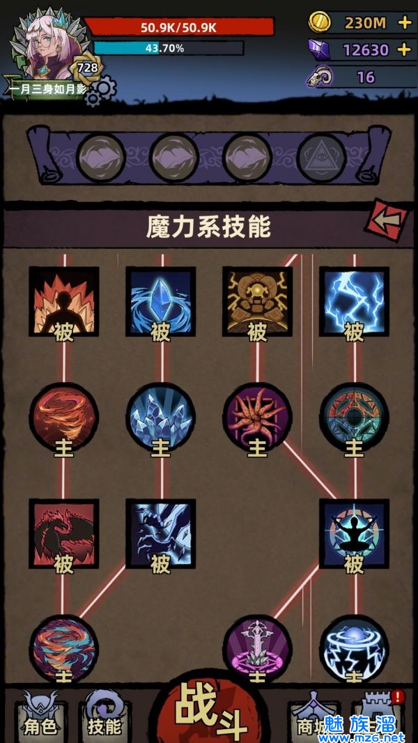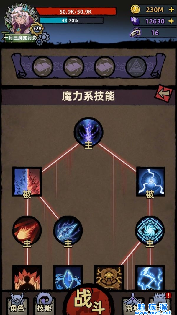 法师的技能与勇者、猎魔技能全靠抽完全不同,有自己独有的一套技能树,从一开始就能看到法师的所有技能,并规划学习路线,从左到右依次是火、冰、毒、电五种属性,综合来看推荐主修左边冰火两重天,右边三系普遍弱势不推荐,下面放出整体技能树: