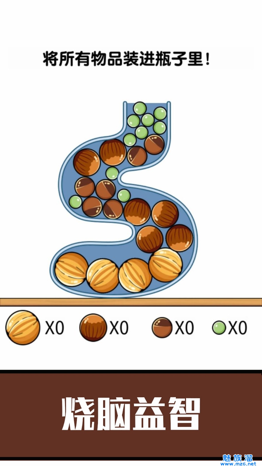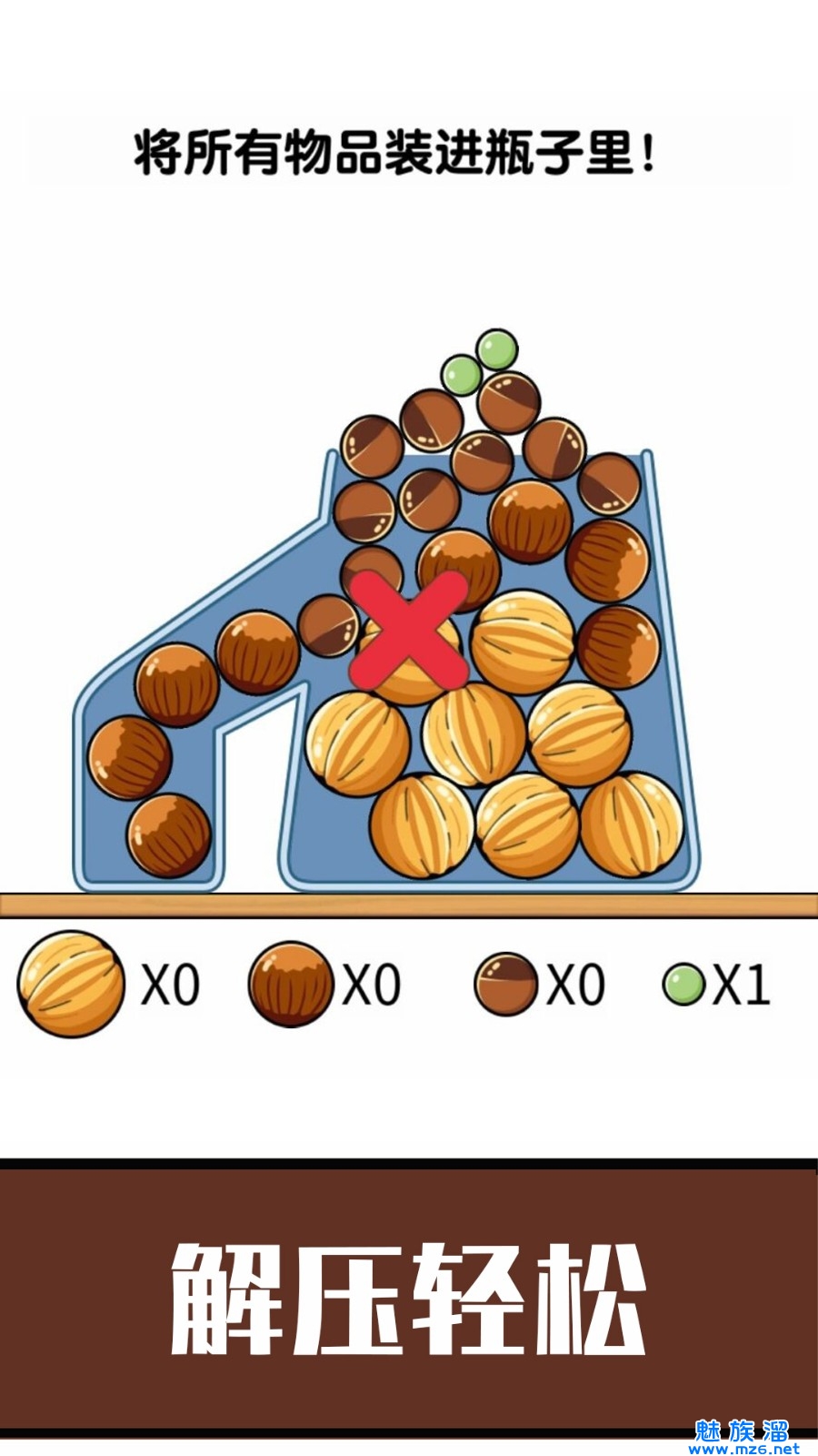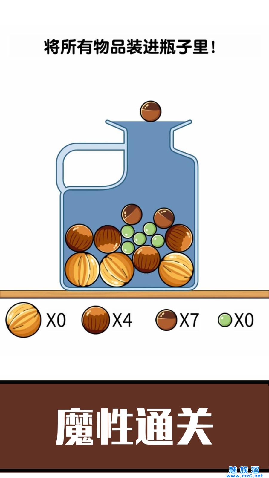 这是一款烧脑益智小游戏,玩家需要将不同的物品依次放入瓶子里才能完成挑战。注意物品不能超出瓶口哦,游戏技巧很简单,只需要合理分配就能闯关成功!快来试试你能不能成功吧!