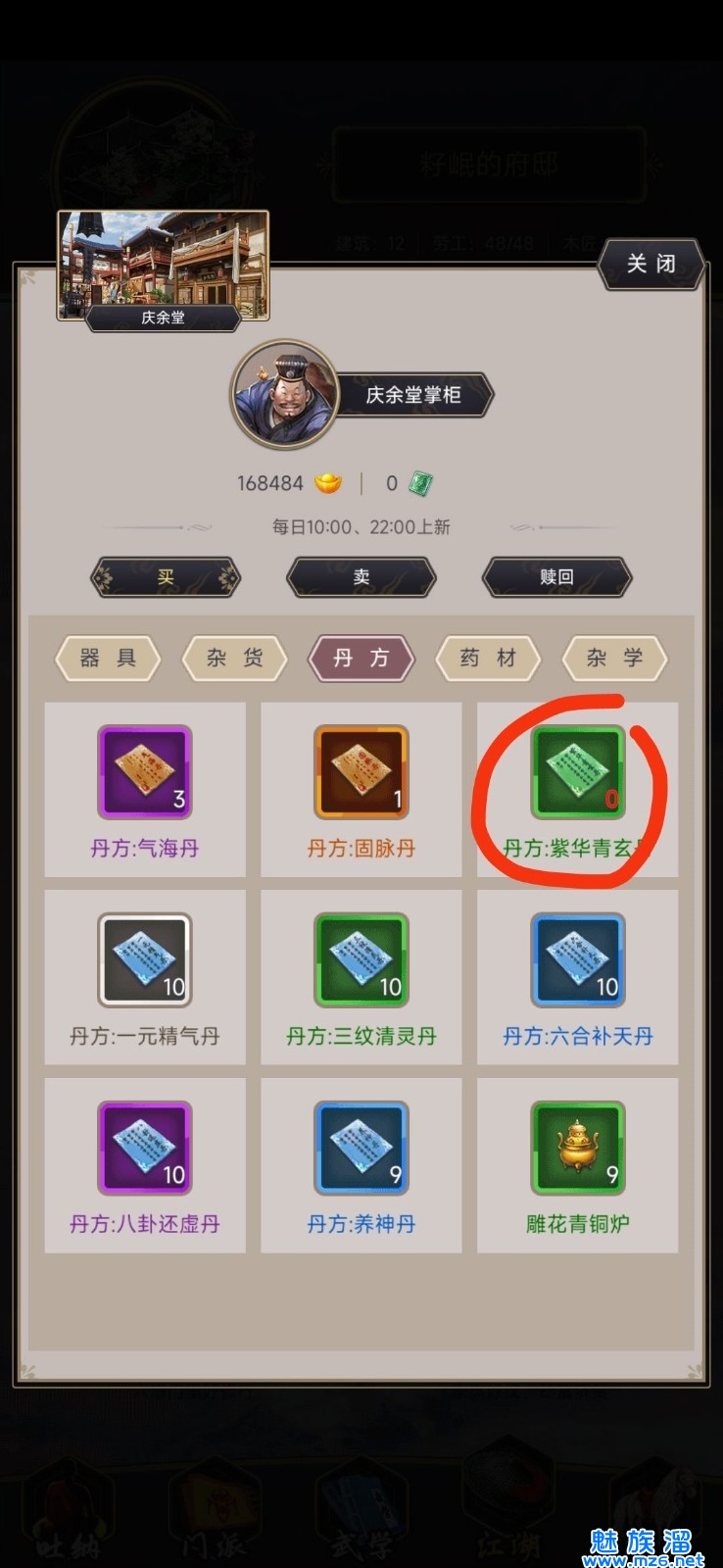 4.去庆余堂买 紫华青玄丹的丹方以及制作药材,成本为2600黄金,每天炼出此丹后吃掉,增加10次历练次数,大概5000多元宝,减去炼丹成本能赚2500左右黄金。