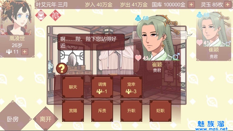 《女帝的日常最新版本》是一款模拟养成类恋爱手游,《女帝的日常官方最新手机》中玩家将在宫廷中扮演女皇帝。为了俘获皇帝的信任,你会为他生儿育女,治理天下。游戏里还有很多有趣的剧情和人物的设定,你一定会感兴趣的,赶紧来下载试试。