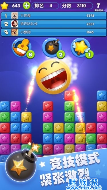 2.竞技模式:与其它玩家在线PK,两分钟时间内分数最高者可以赢得比赛;