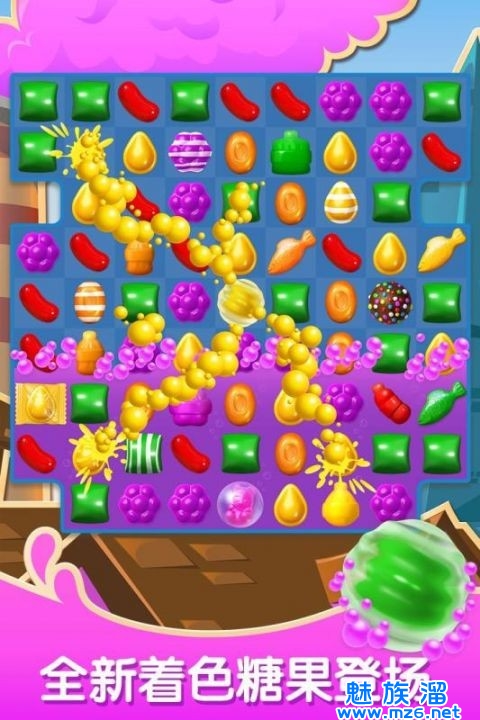 3、果酱模式:游戏开始时,糖果下方有一块果酱。每次成功消除糖果时,消除糖果所在方块会遍布果酱。你的目标是让果酱遍布整个游戏画面。使用特殊糖果时,所有消除糖果所在方块均会遍布果酱,例如条纹糖可以使整列或整行方块遍布果酱。