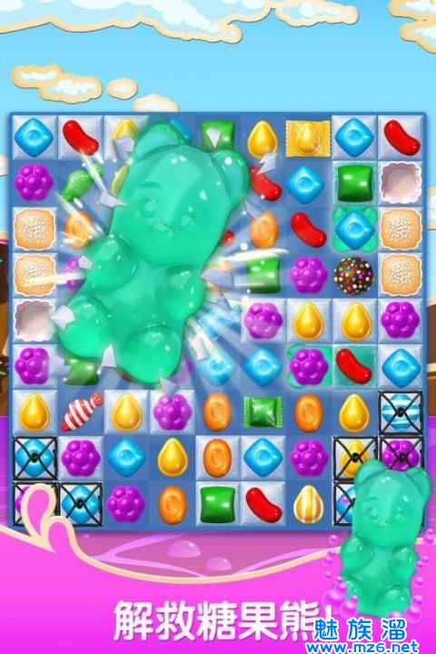 2、蜂蜜模式:目标是解救被蜂蜜困住的糖果熊。在蜂蜜旁边进行消除即可解救糖果熊。每个空格显示的蜂窝数量表示完全消除蜂蜜需要的消除次数!