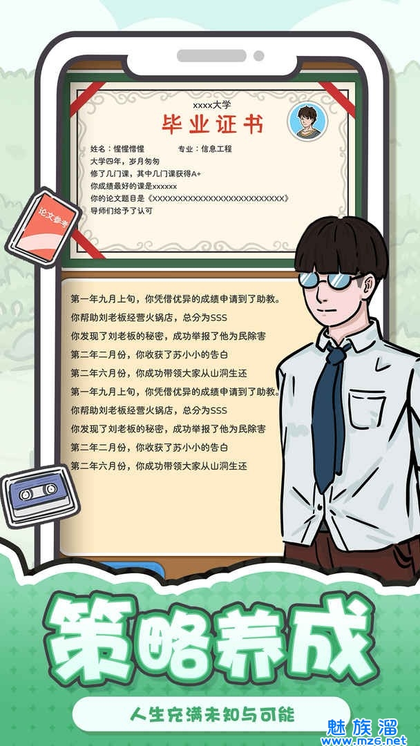 《我和我的大学》是一款角色扮演类模拟大学生活主题的文字剧情手机游戏,玩家将化身为大学生,在学校里面不仅要完成学业课程,还能邂逅唯美的爱情生活,体验丰富精彩的故事剧情走向解锁不同的人生结局,感兴趣的小伙伴还不赶紧下载畅玩我和我的大学!