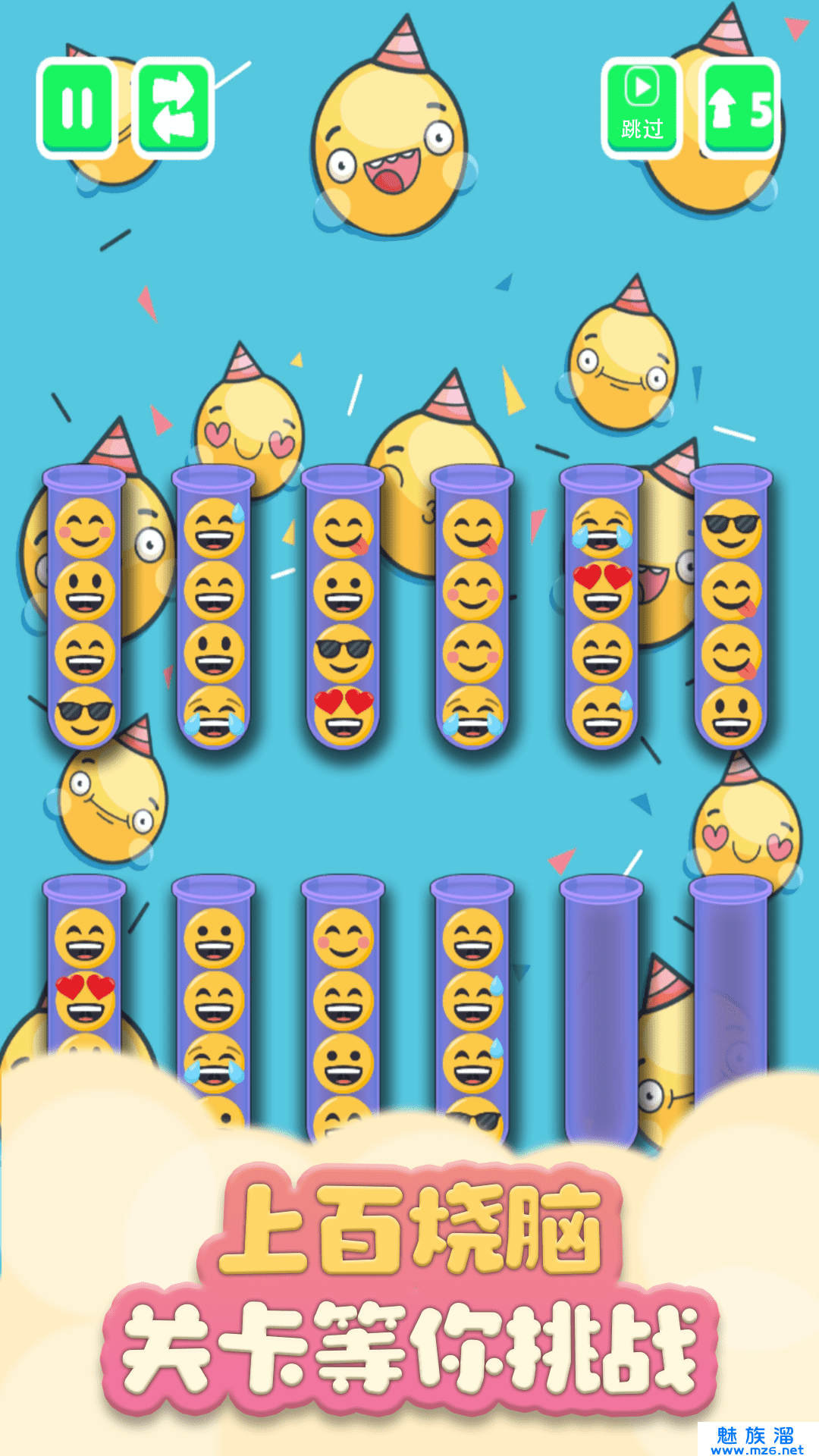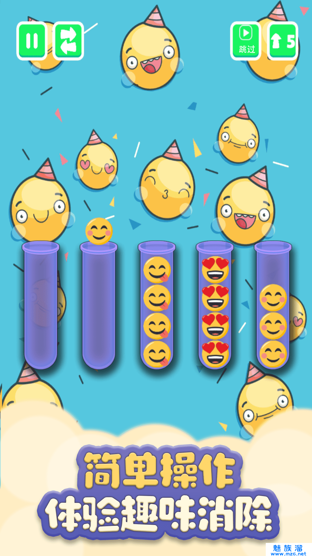 通俗易懂的游戏规则,通过将相同的表情包放置在同一个试管当中,叠加到三个就可以进行消除!