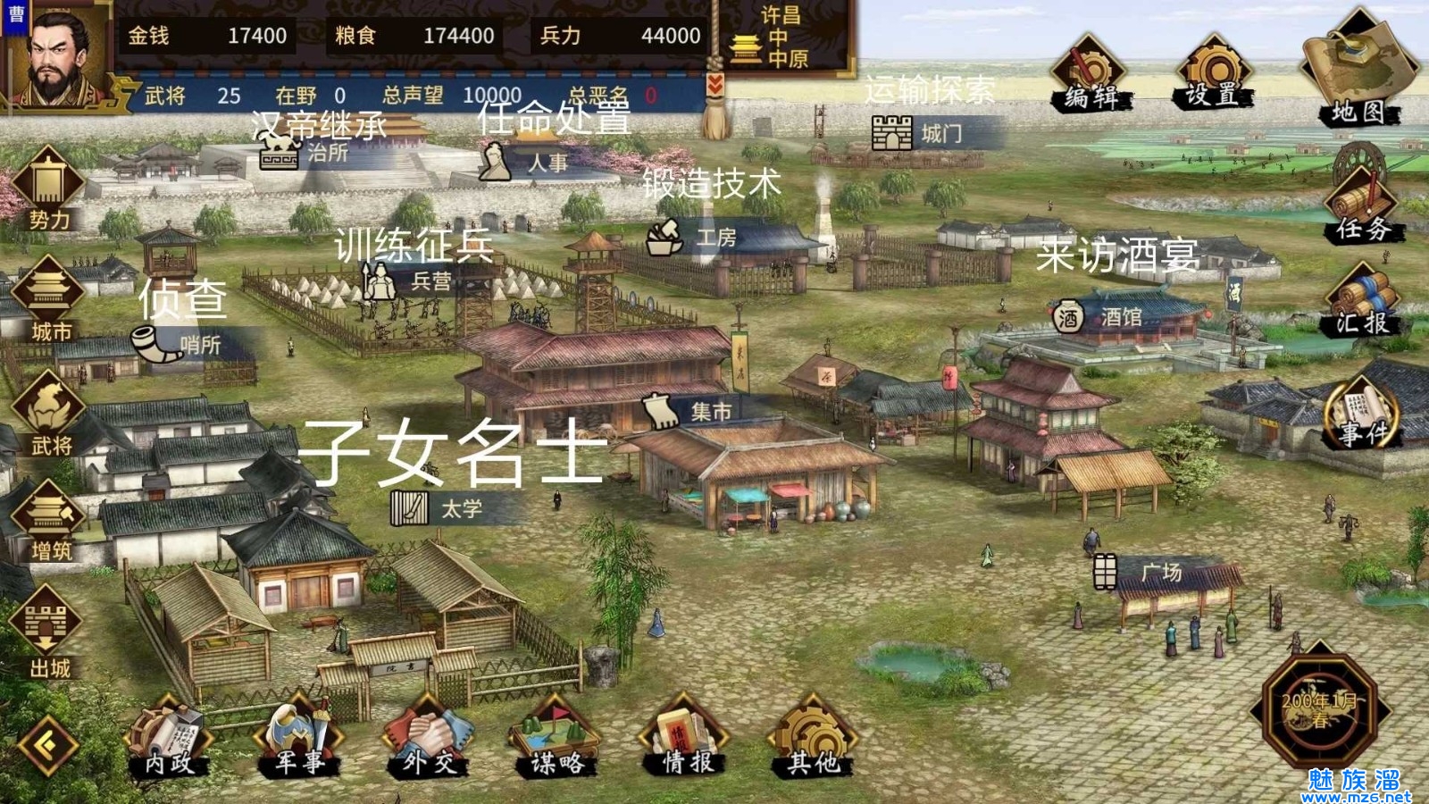 治所:汉帝可以刷贡献度(耗费钱粮),贡献度可以升声望降恶名,还有其余功能,这个新手先不管,先入门。