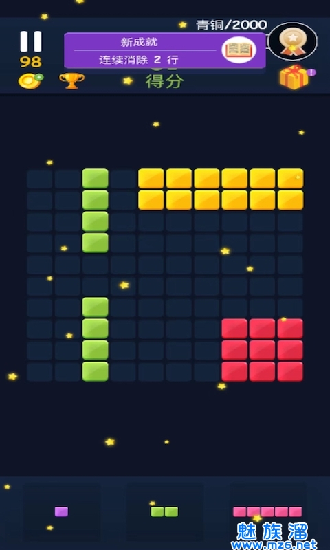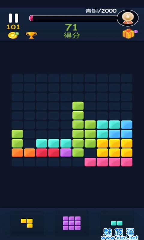 3.游戏玩法:经典使用虚拟按键控制俄罗斯方块的变形与下落,消除的行列越多,得分越高。创新玩法如拖动,方块操作简单一秒上手!