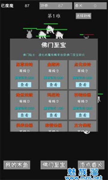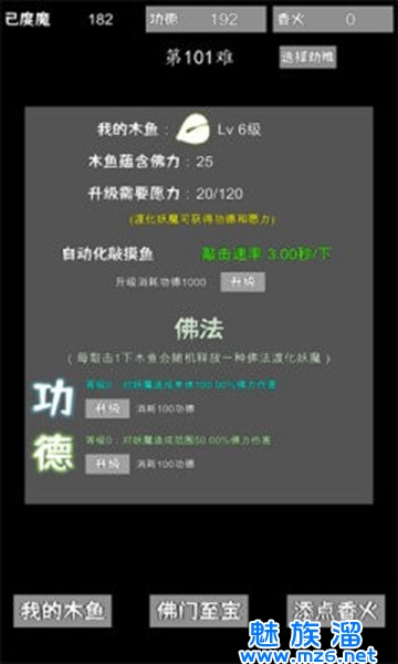 1、每敲击1下木鱼会随机释放一种佛法渡化妖魔,渡化妖魔有概率收获佛门至宝碎片合成佛门至宝。