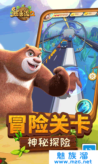 1、操作熊大要灵活的躲避各种机关的攻击,游戏内跑道的构造都是非常复杂,跟动漫内森林都是非常的相似;