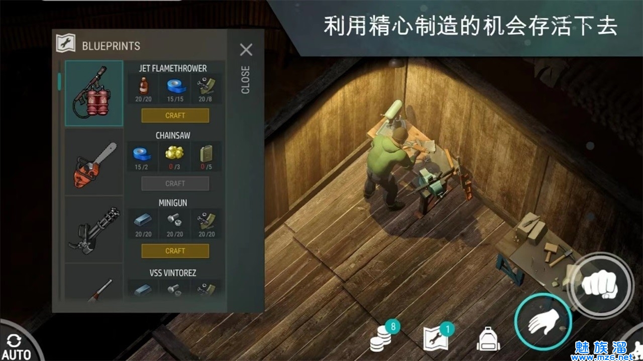 3.探索这个颓败的世界,利用可利用的资源,铸造各种器具,建造容身的房屋,捕猎以获得食物,还要对付可怕的僵尸以及敌人;