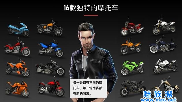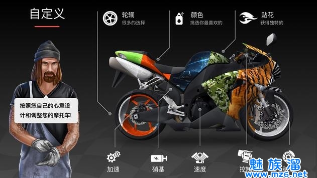 1、逼真的摩托车,设计十几种不同的摩托车型供您选择,随意挑选一款设计,来改进外观以及性能来开始比赛。
