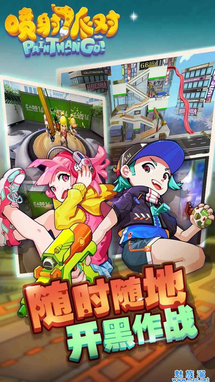 喷射派对游戏采用Q萌画面,嘻哈主题风。玩家将扮演喷射战士,选择各种喷墨武器在涂鸦城中展开角逐较量。百变地图,百变武器,百变时装,肆意涂鸦打造全新另类射击体验。