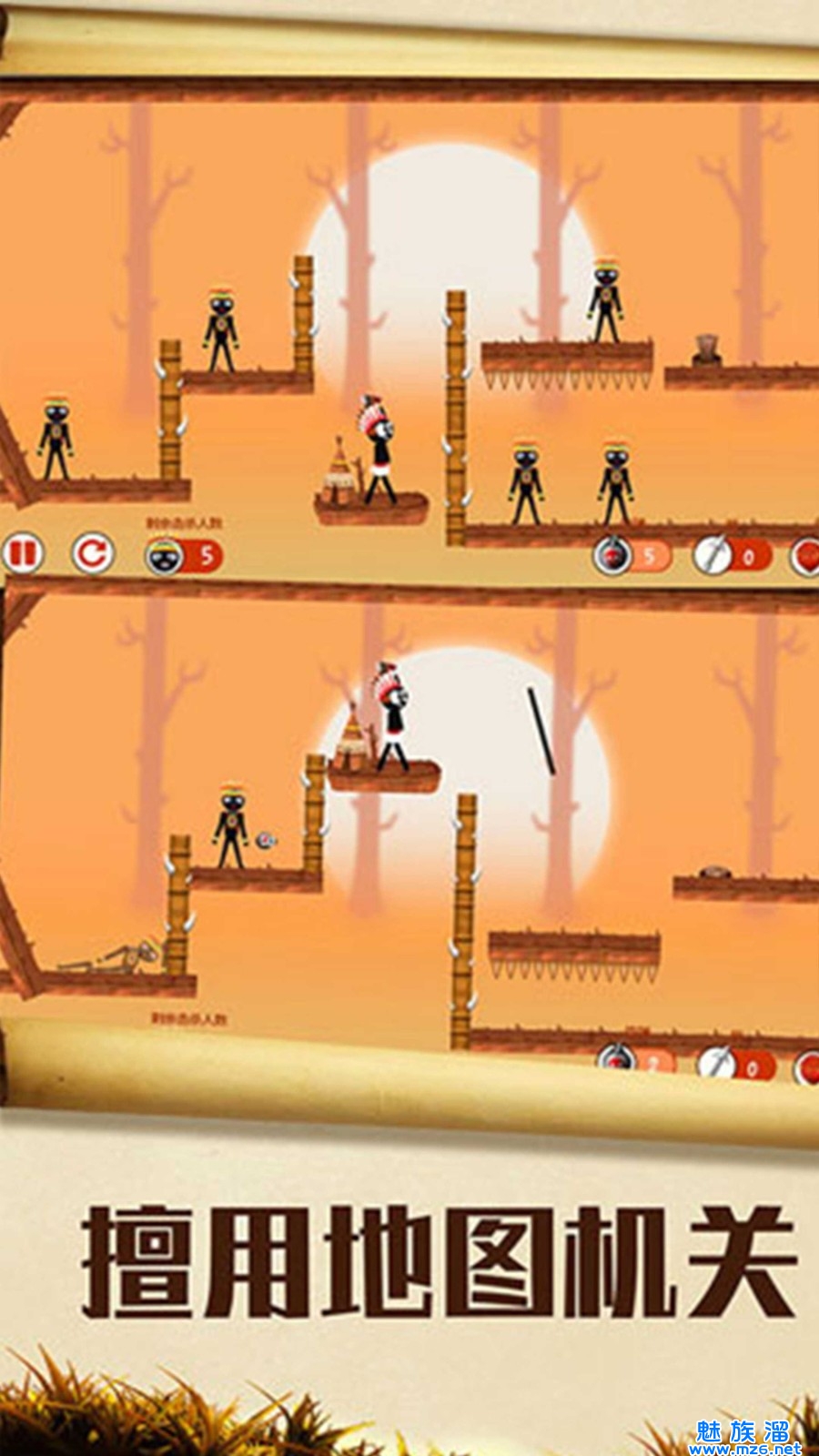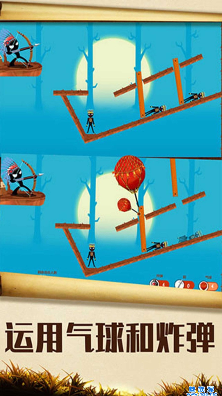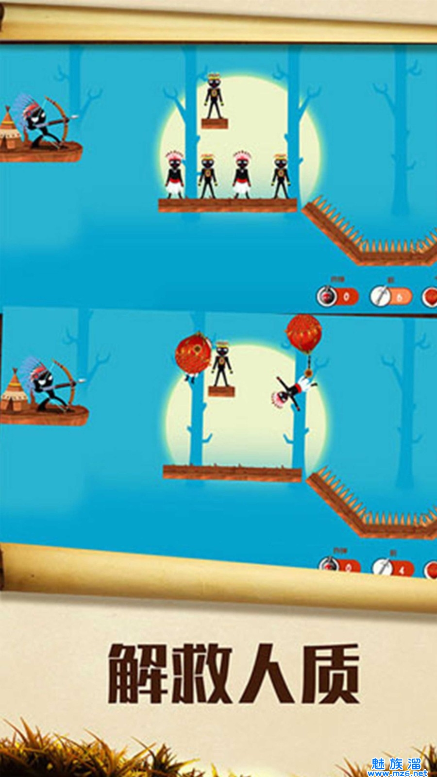 你要找到合理的射箭位置,把每个吊在树干上的人物全部救下来,这样才能完成关卡的挑战