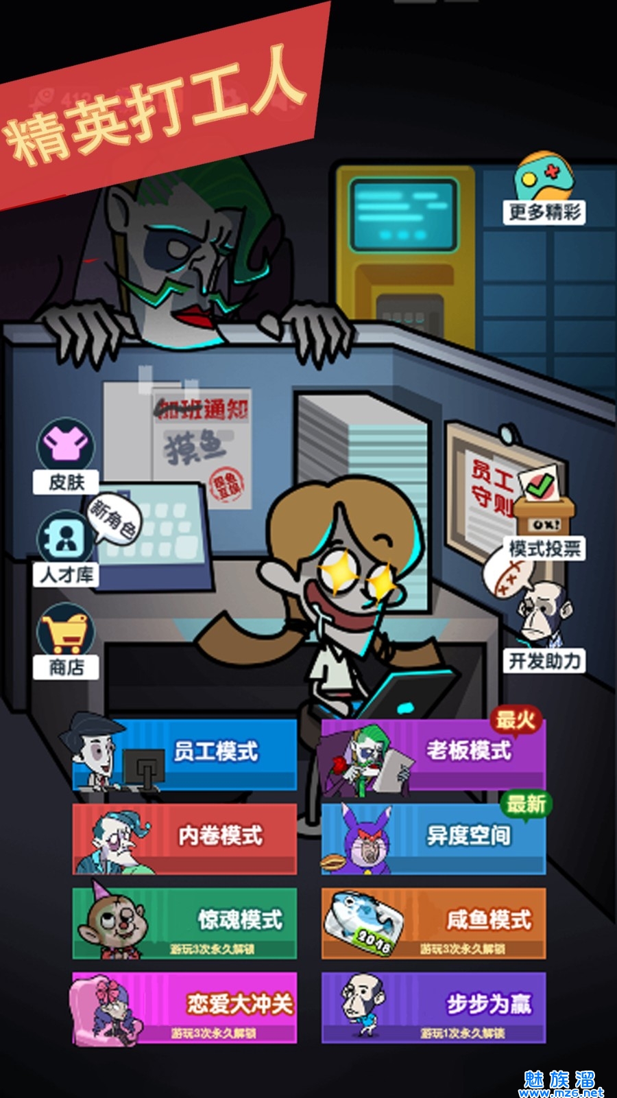 1、需要不断的和凶恶的老板进行对决,添加了很多好玩的角色。