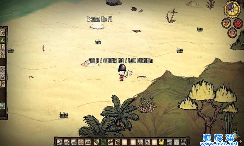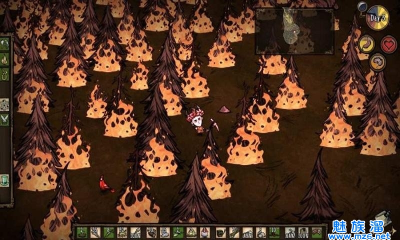 3、注意时间,夜晚的野外会有野兽出没,时钟上的橙色和蓝色代表黄昏与夜晚,这时候你需要火来照明。木材可以增加火堆的照明范围,同时可能会把旁边的树烧着。