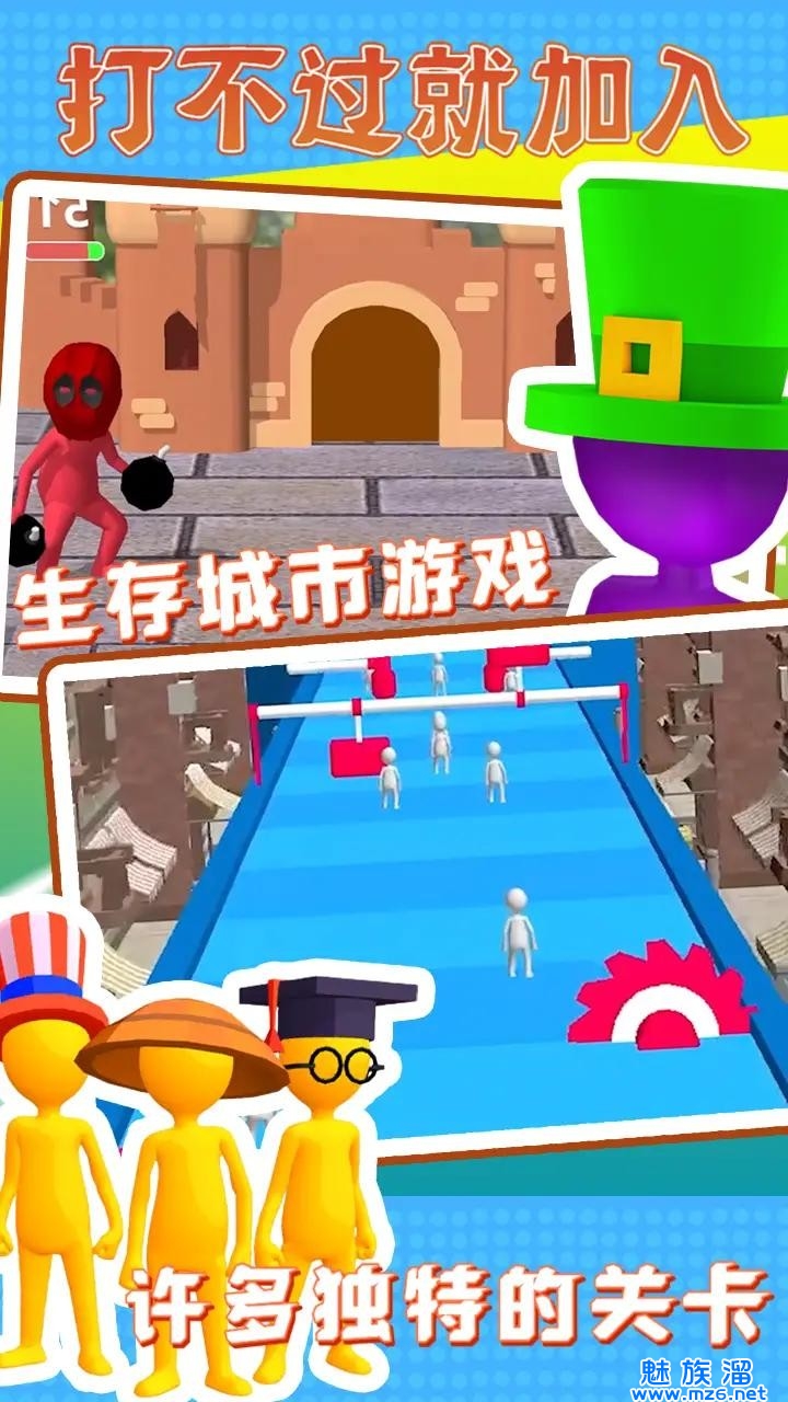 打不过就加入这款游戏结合了跑酷和动作的元素,我们可以率领超多的团队战斗,在两个门之间选择来增多自己队伍人群又或者减少,需要依据前方的挑战来选择,超多好玩的元素等着你的体验,后面还有排行榜挑战哦,上榜有道具解锁!