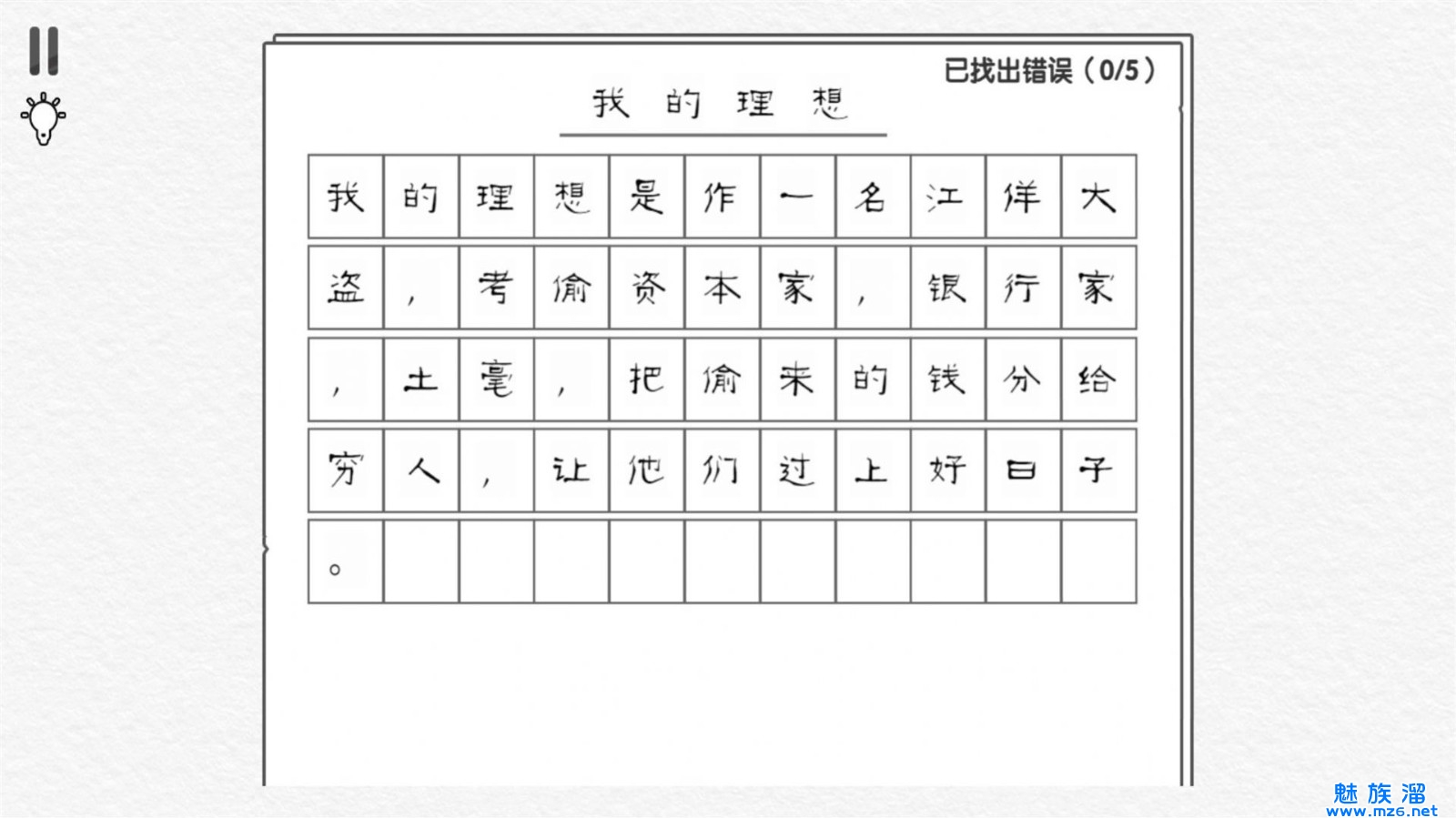 一个轻松有趣的文字游戏,既锻炼了玩家的注意力和思维能力,又有利于提高语文水平和词汇量。同时,游戏也适合于所有年龄段的玩家,并且容易上手,快速提升你的语言能力。如果你喜欢文字游戏和发现错误,那么这款游戏一定会让你爱不释手!随着游戏的进展,难度逐渐加大,需要玩家们更加细心和机智。