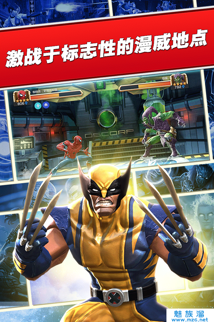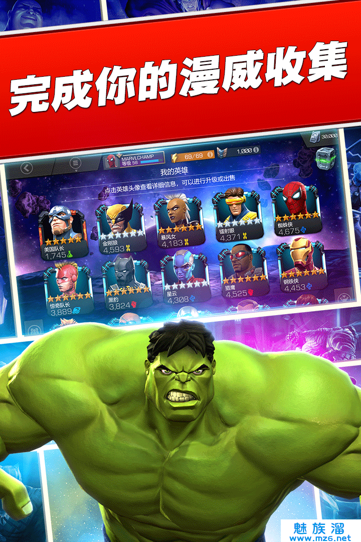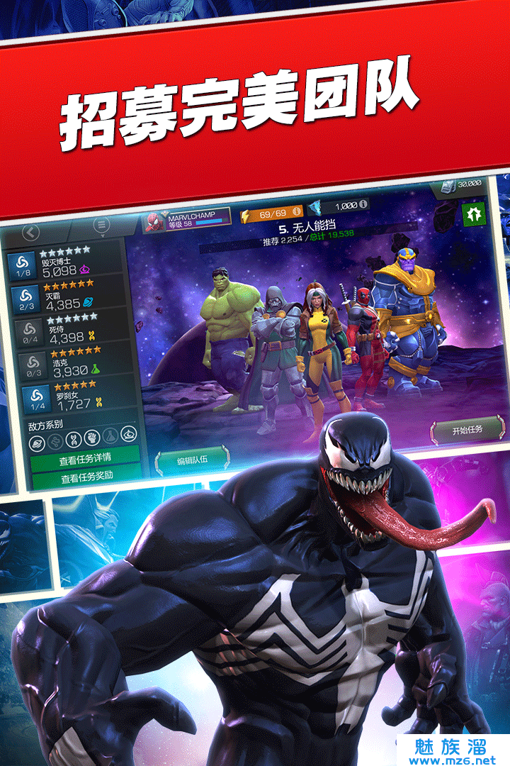 收集,升级,并根据漫威漫画情节中的人物关系,妥善地安排队伍中的英雄和反派成员来获得队友加成;