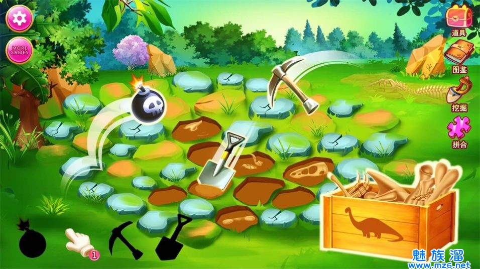 2、自由挖掘的游戏玩法,让玩家可以自由体验挖掘恐龙化石的过程。