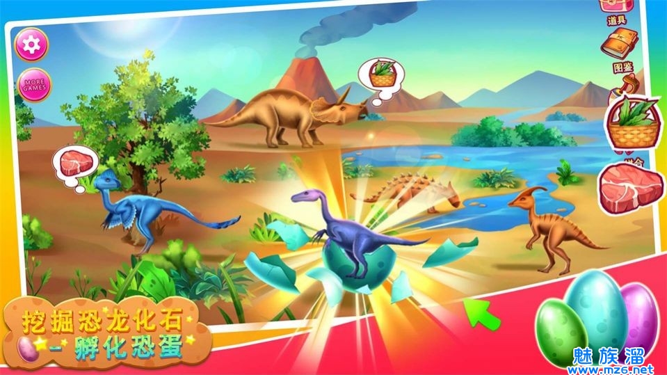 1、挖掘恐龙化石和孵化恐龙蛋,让玩家感受到恐龙世界的神奇。