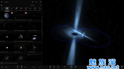 3、观察一个场景,用户自己操纵这些恒星,将太阳放置在一个质量是银河系10倍的黑洞中,并在1秒和30000年内吞下第三个悬臂。