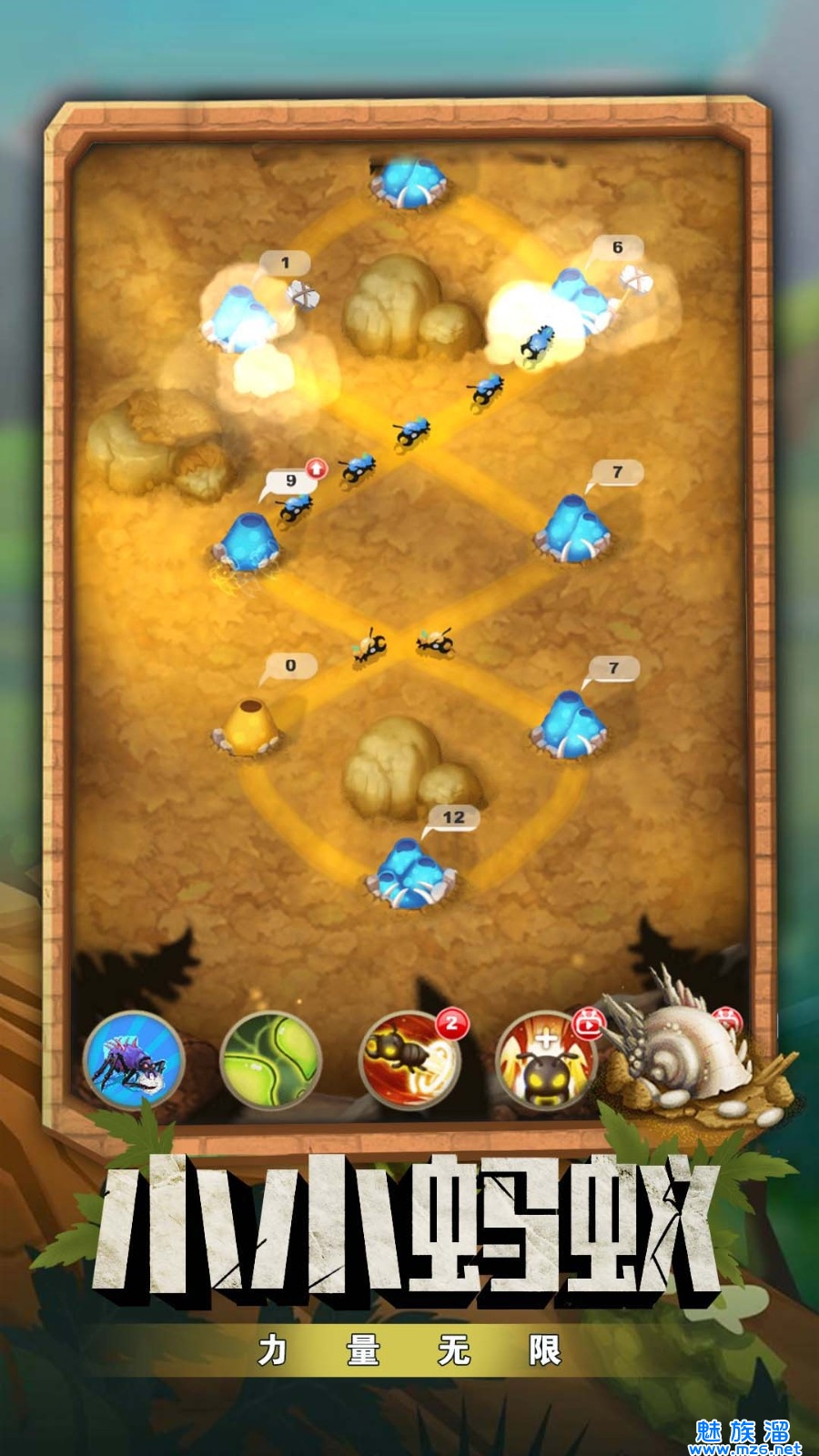 蚂蚁指挥官游戏是一款精彩蚂蚁军团策略游戏,你需要通过建立强大的蚁巢,招募大量蚂蚁和生产强大的技能来维护和发展自己的实力。同时,你需要运用策略和战术,在和其他蚁后的斗争中获得胜利。点评:这款游戏将玩家置于蚁巢中,沉浸在繁琐而有趣的蚁前工作中。孵化小蚂蚁,增加蚂蚁军团,建造你的蚂蚁帝国。
