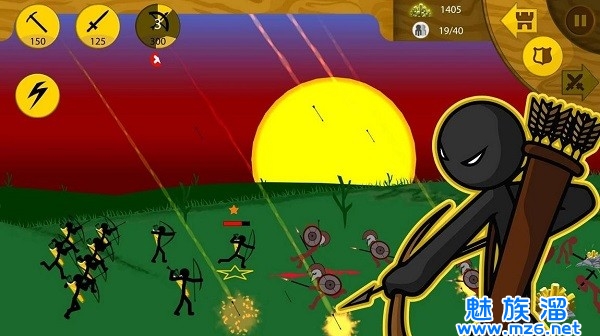 然后等敌人来了后控制矛兵,然后让矿工撤退,让城堡弓兵射,你就顶个盾吸引伤害不让敌人打雕像就行了