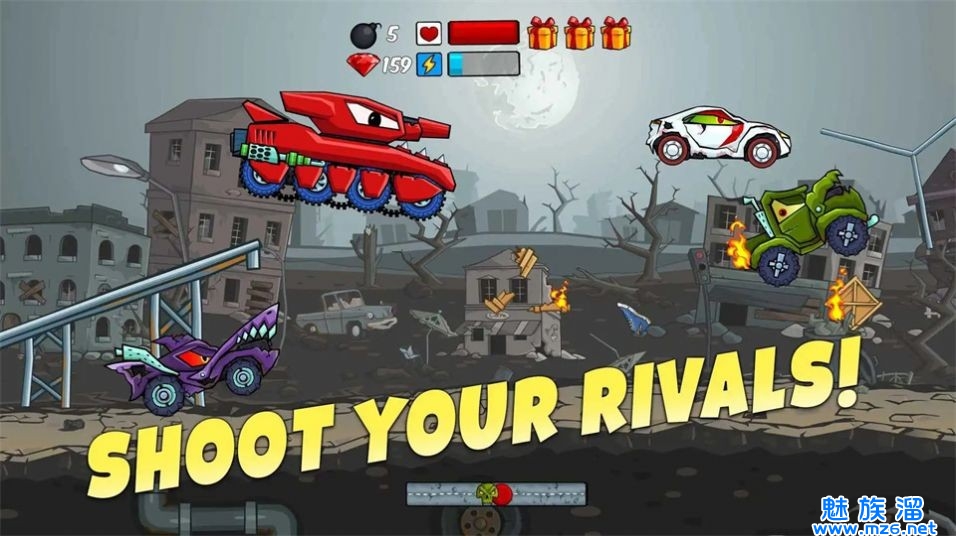 车吃车启示录游戏是一款独特的求生游戏,汽车上除了武器和防护装备,其它一无所有。玩家需要操纵自己的车辆,在一个充满了陷阱和危险的城市中奋力前行,攻击并摧毁其他车辆,从而获得越来越多的金币以及各种各样的奖励来提升自己的实力,不断解锁新的地图和道具,逐渐成为这个荒芜世界的主宰。