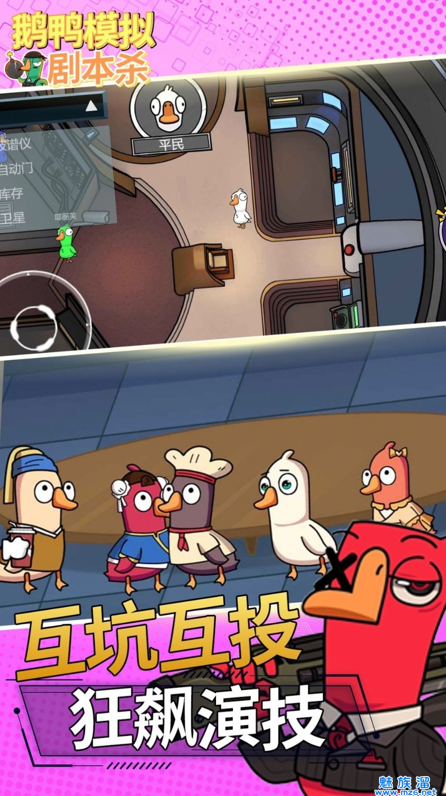 基础规则:平民为鹅,杀手为鸭子,在地图自由活动期间鸭子可以直接刀人,刀人有冷却CD,鹅被刀之后会留下尸体(鹅腿)。