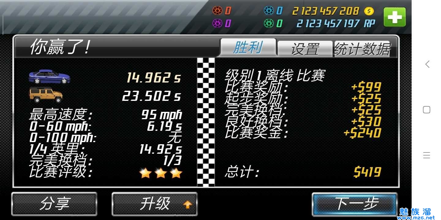 5、比赛结束后会显示玩家最终的成绩,以及奖励情况。