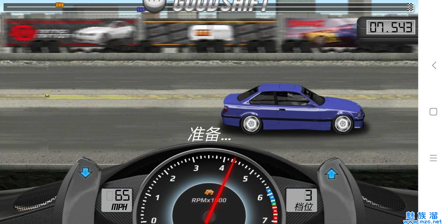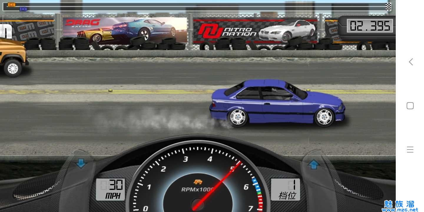 一款安卓平台上的2D赛车游戏,比赛方式很简单,两辆车,哪辆第一个冲过设 定终点线就算胜利,该游戏不同于技巧类型的赛车游戏,更多的考验你的反应能力和判断能力,支持联网对战,增加了一定的乐趣!该游戏的玩法非常简单,游戏开始前,你需要购买一辆新车,一开始,踩油门启动游戏,然后必须要通过速度表两侧的挂档按钮来逐步提高汽车的形式速度。快来享受飙车时候的急速快感吧!