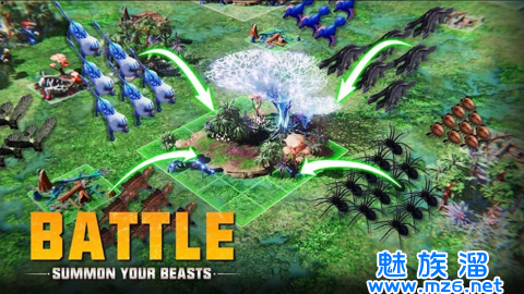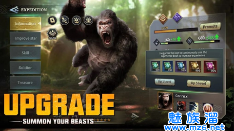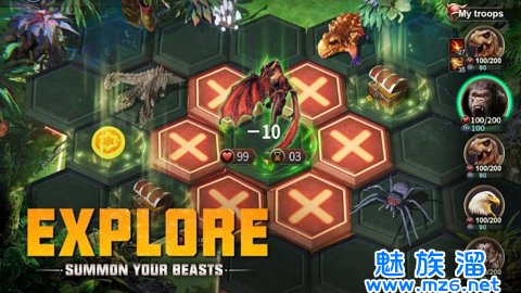 玩家将面对大猩猩、猛犸象、三角龙和其他强大的野兽。你的任务就是收集这些猛兽,组建一支强大的军队,获取资源和财富,发展壮大你的帝国