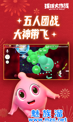 2.团战模式:团战模式一局10个队伍,每队5人,玩家可以通过邀请其他好友开团,或者自己参加,系统会为玩家自动匹配到其余队友。所有玩家初始大小相同,与自由模式不同的是同一队伍中玩家不会吃掉队友的最后一个球。玩家死亡后会按照最初大小复活。在到达结束时间时结算,会按照团体总重量进行排名,排名达到一定值的玩家可获得奇妙宝箱以及段位星数提升的奖励(根据具体段位)。