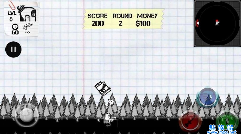 1.是款风格简约的射击类类游戏。游戏中玩家要在卷轴式的涂鸦世界中穿梭,更新自己的武器消灭涂鸦们的暴动