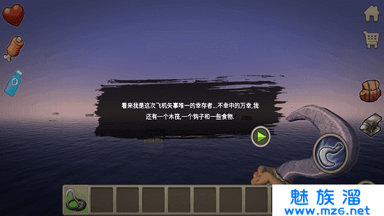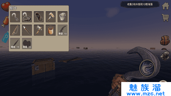 1、玩家可以使用钩子来对海中的资源进行收集,加固自己的木筏,制作更多的生存道具。