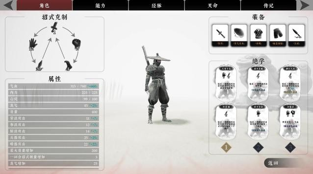 (3)独创的经脉系统,将人体经脉的运转进行了简化概念设计,玩家可以体验到不同的运功路线激活不同内功的拟真感受,简洁却富有策略玩法的设计给玩家提供了搭配和激活多种内功的玩法。同时经脉系统也结合了武侠小说中各种身体机能的具象表现,角色的生命力、内伤、隐疾、蛊、生死符、残疾、瞎眼等等。