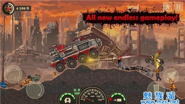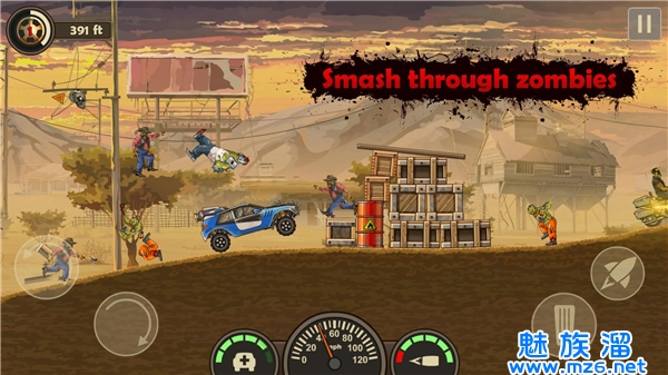 3.同时瞄准并消灭阻挡在前方的僵尸。玩家需要破坏场景中的障碍物,清除路障,以便在赛道上尽情驰骋。