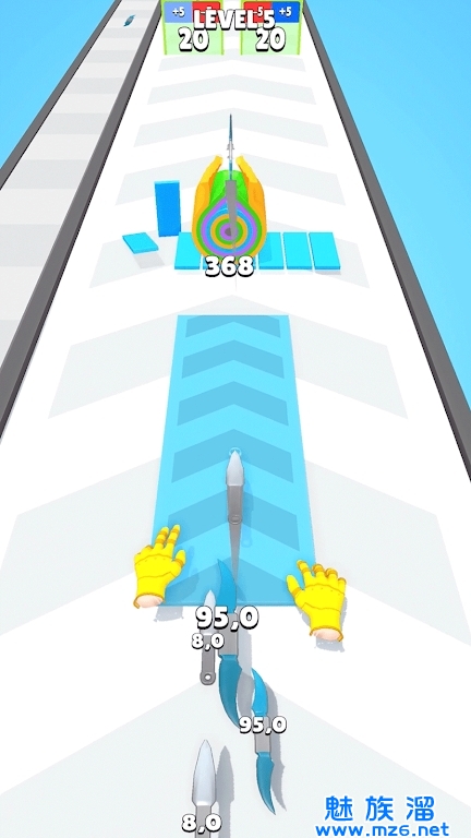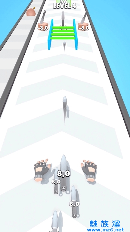 3、到达终点后随意滑动屏幕控制瞄准系统,用剩余飞刀消灭坏人获得奖励。