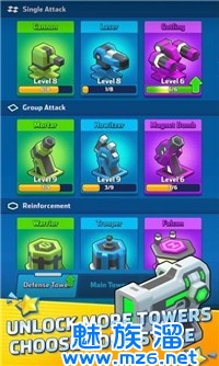 1、多种不同类型的炮塔可以选择来使用,不同等级的炮塔攻击力强度是不一样的。游戏中的区域设计非常丰富,