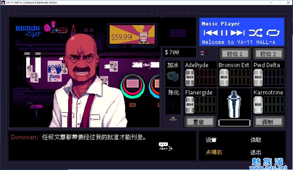 1.作为一名赛博朋克酒保,你需要经营好自己的酒吧。你可以购买各种酒品和食物,为顾客提供服务。
