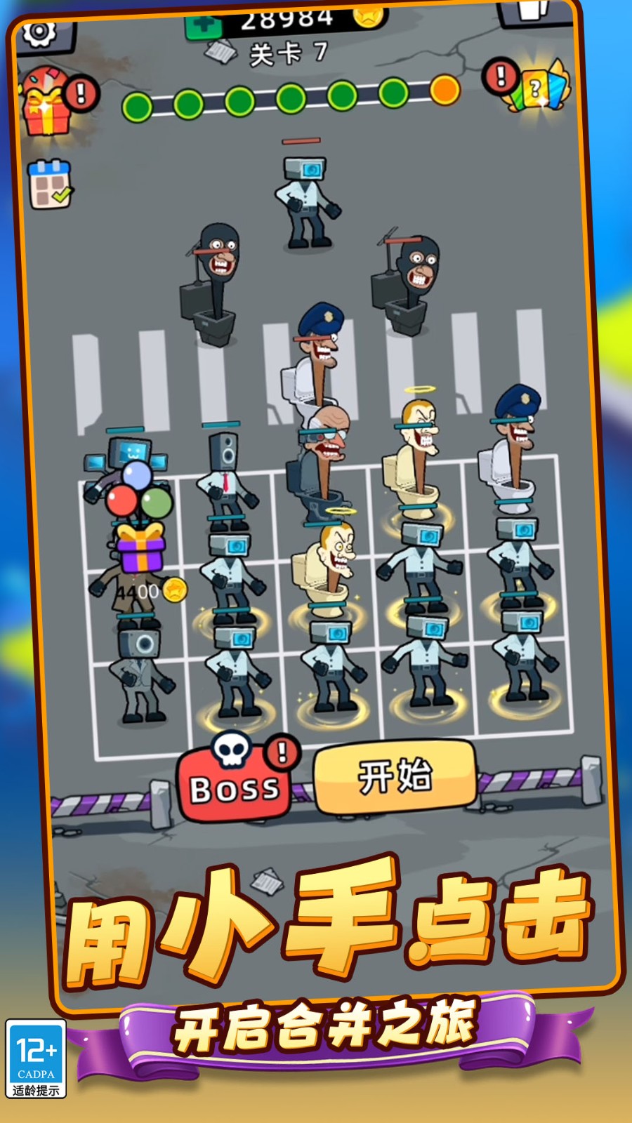 1、游戏主要通过合并不同种类的马桶人来获得更强大的力量;