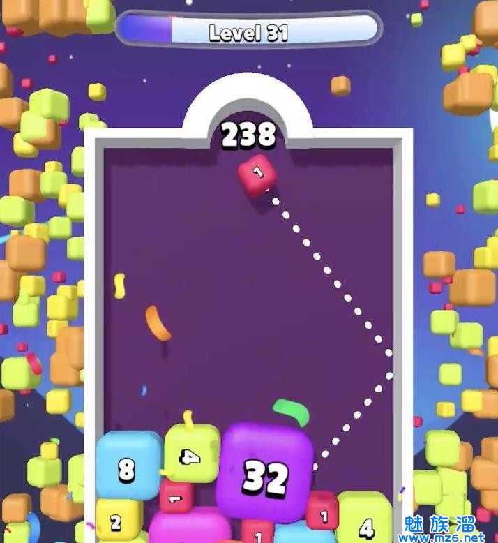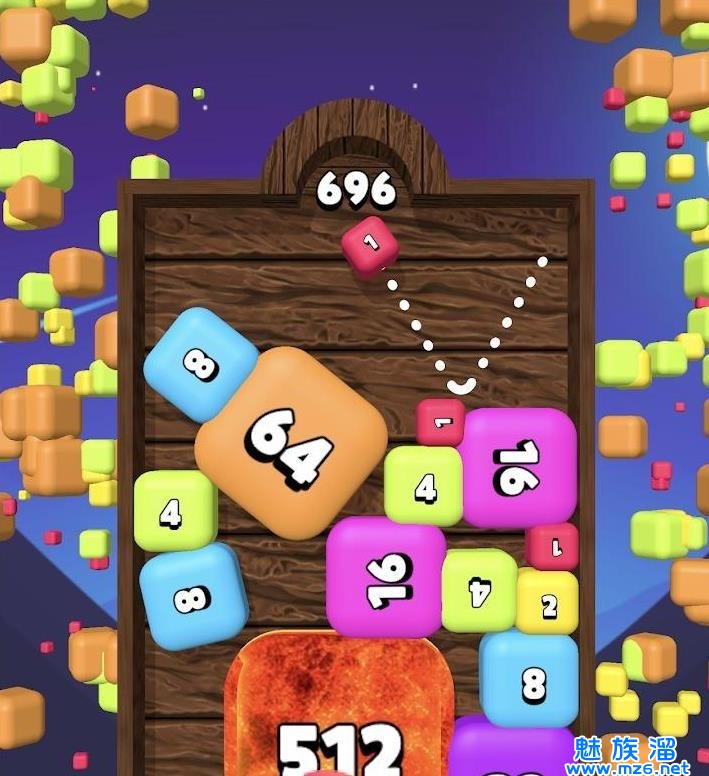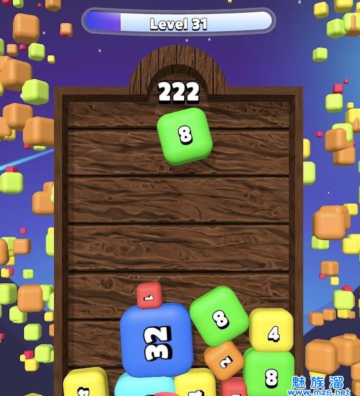 3、合成的数字越大方块的体积就会越大,当你的场景放不下方块时就会闯关失败。
