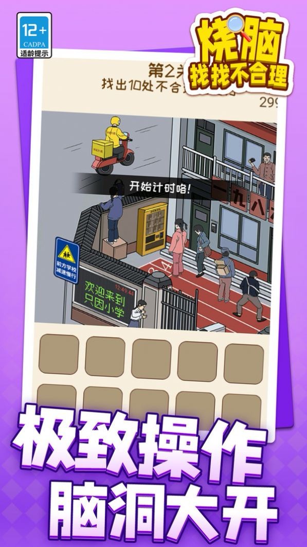 烧脑找找不合理是一款休闲益智类烧脑解谜游戏,游戏在抖音非常受玩家欢迎,其中拥有数十个不同的游戏关卡,每一个关卡都有独特的游戏场景,玩家需要根据任务要求,在场景中寻找出不符合场景的事物,只要寻找到所有不符合常理的事物就可以顺利突破关卡。