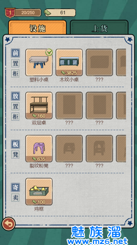 1、从初始的小卖部布局开始,选择合适的位置和面积,购买货架、货物和设备等;