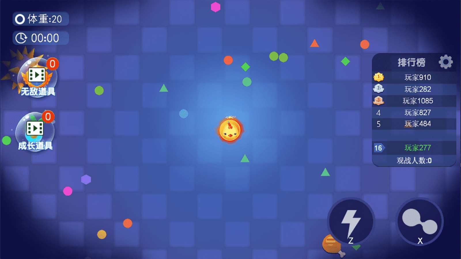 1、其中玩家要不停的去吞噬其他玩家的球球,并且及时升级自己的球球;