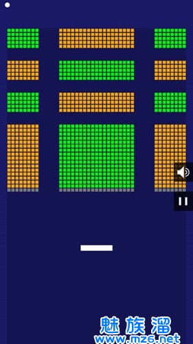 1.玩这个游戏的时候,玩家需要操控一个横条去使小白球反弹从而毁灭一块块砖块,那么怎么才可以把所有的方块打完呢?技巧在于把小白球打到两排方块的中间,例如下图,会使它掉不下来,会一直在上面反弹!