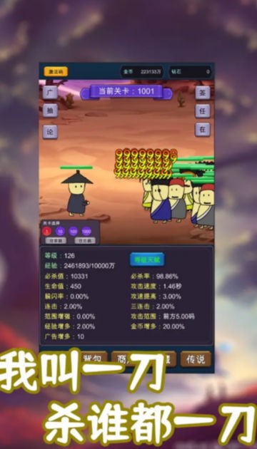 一刀必杀9999999游戏是一款卡通画风角色扮演类冒险闯关游戏,游戏中玩家将会扮演一名无敌剑客,利用自己的剑术,在各个不同难度的关卡中进行战斗,通过不断的战斗来提升自己的等级,解锁更多高级的武器、装备,武术秘籍,大大增强自己的战斗能力。
