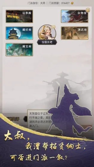 打开醉仙楼——门派接引看看是否有较好的门派,可以参考《江湖小数据》获取该门派的武学相关数据,这是前期前往有强力技能门派的重要途径,注意每天必看。