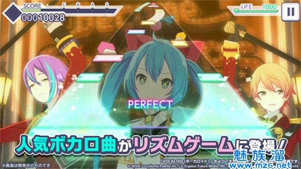 节奏游戏采传统的下落式玩法,并设有五种不同难度。初收录曲共有28首,在游戏正式开始配信后更会在20天内每天公开新曲,当中不乏经典Vocaloid 名曲,像是《Just Be Friends》、《初音未来的消失》、《メルト》等等。